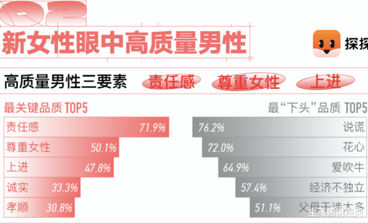 比如,探探就发布一份《新女性择偶标准》,提到最受女性欢迎的男性特质是“有责任感,尊重女性,上进”。